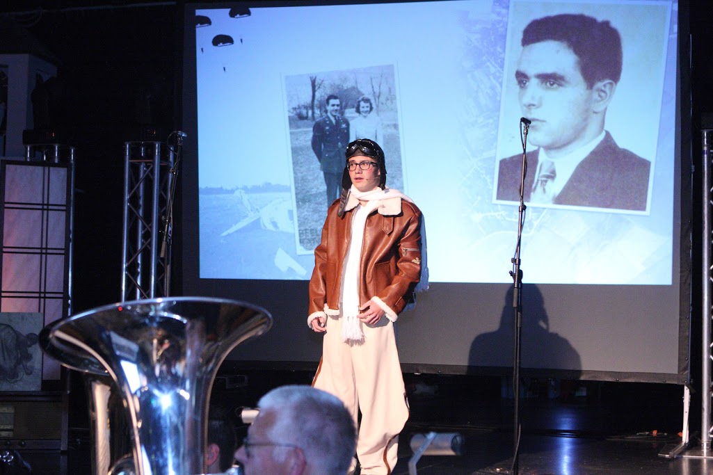 De Angerenaren die op het land hard aan het werk waren dachten dat de bevrijding nabij was, maar dat bleek nog wel even te duren. We hoorden hoe Gijs in het verzet ging en we zagen een parachutist van achter uit de zaal komen en een noodlanding maken op het podium. Deze piloot Howard Moebius werd gespeeld door Bastian Wagener. De piloot vertelde hoe hij door Gijs werd geholpen onder te duiken. En hoe mooi en dichtbij kan het zijn… deze piloot zat 70 jaar geleden ondergedoken in een ruimte naast de huidige slaapkamer van Bastian.